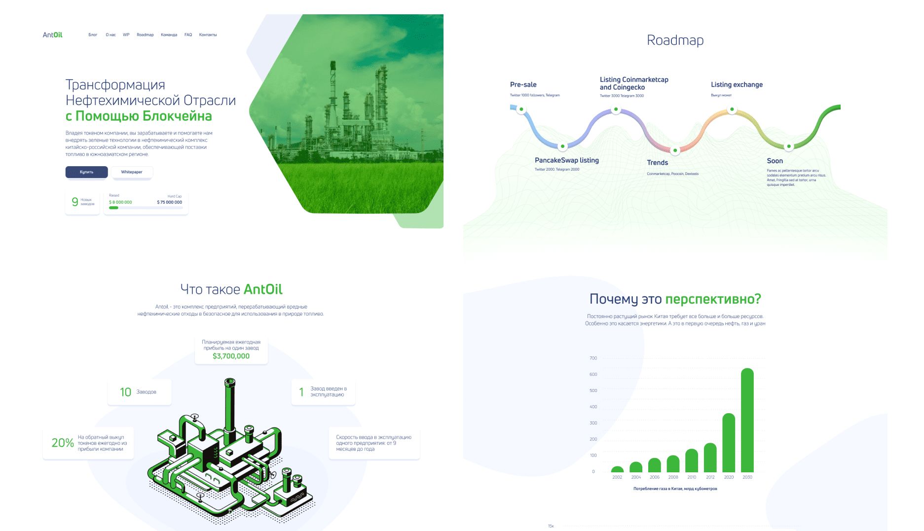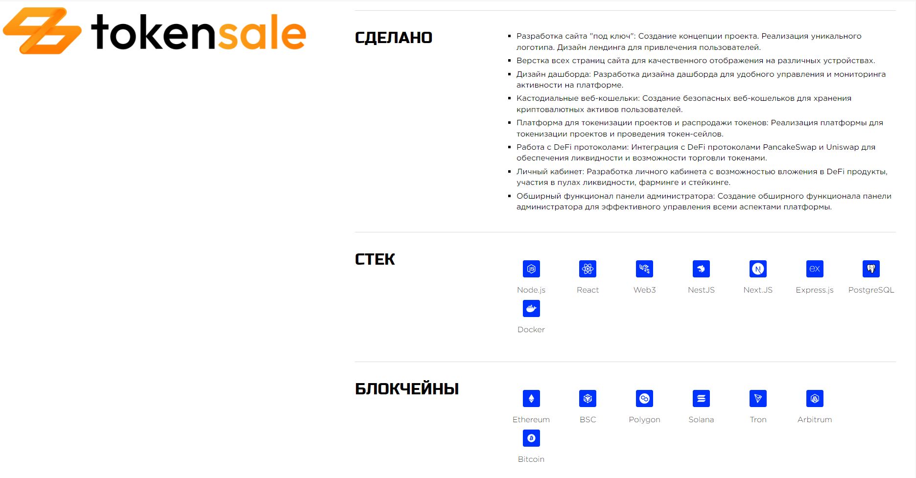 Для проекта создаётся смарт‑контракт токена, токеномика с визуальным распределением, лендинг с описанием рынка и преимуществ, а также интерфейс для участия в продаже токенов.