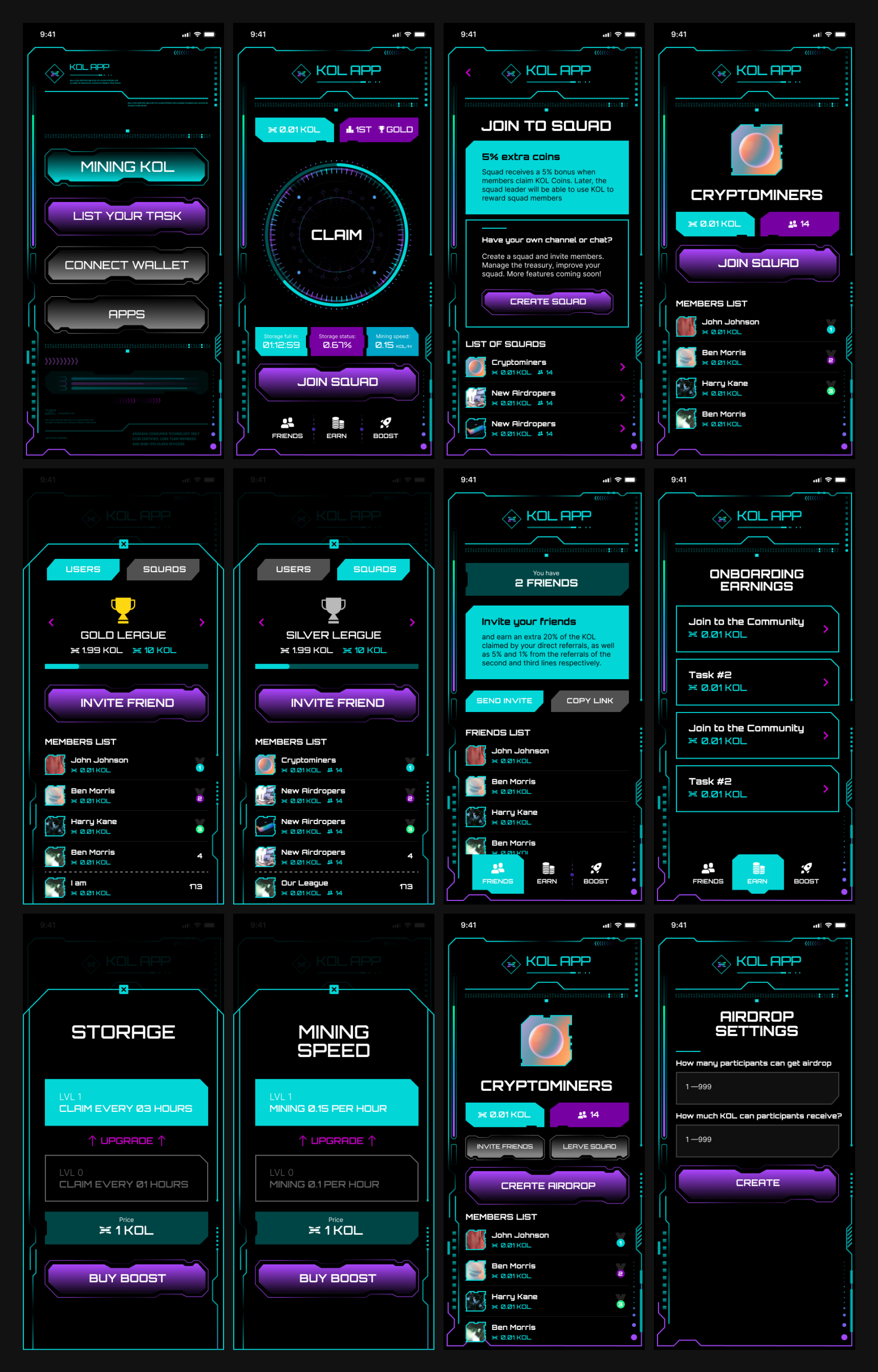 - Майнинг токена: экран Claim, отображение скорости майнинга, лимита хранилища, таймеров до следующего сбора