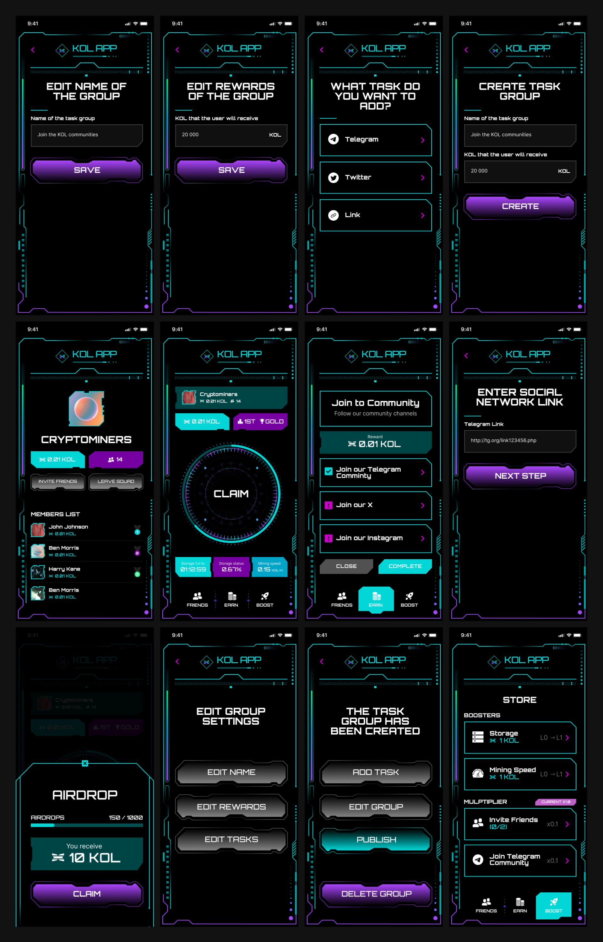 - Заработок на заданиях: групповые задания “Join to Community” и др., типы задач Telegram/X/Link, кнопка Complete, ввод ссылки-подтверждения, начисление вознаграждения в KOL