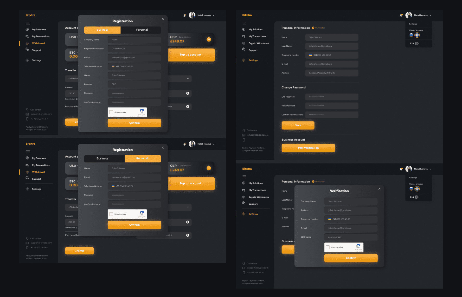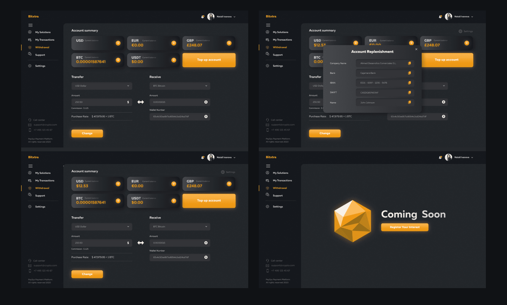 Создание личного кабинета платежной системы с широким спектром функций: управление личными данными, счетами в различных валютах, возможностью получения и вывода наличных через SEPA и SWIFT, обмен валюты, а также доступ к истории транзакций, статусу аккаунта и чату поддержки. Важным аспектом является поддержка мультиязычности, включая английский и русский, с возможностью расширения до 16 языков.