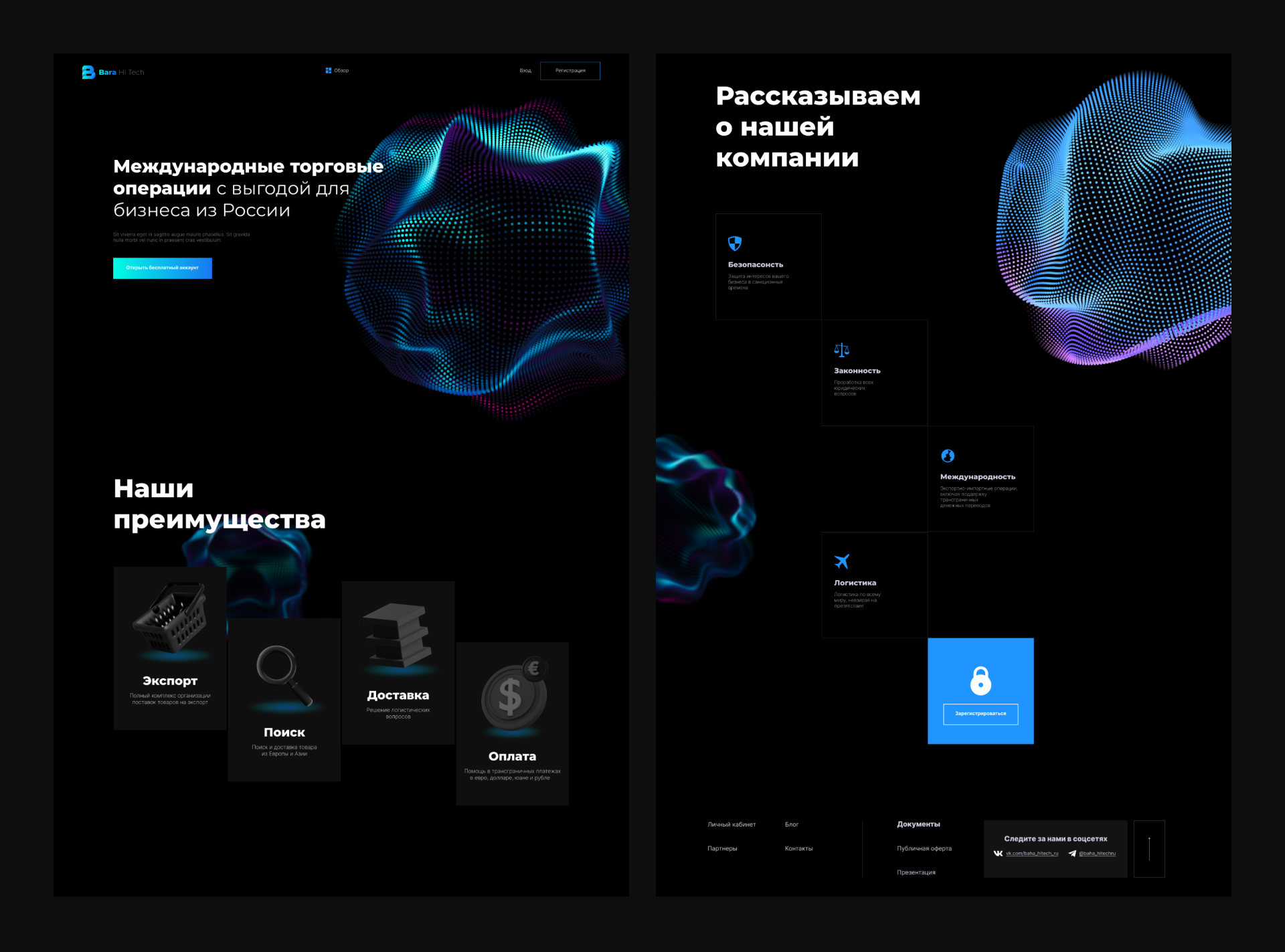 Построить доверие и конверсию: тёмный строгий UI с неоновыми 3D-анимациями, модульные карточки «Экспорт/Поиск/Доставка/Оплата», пошаговый путь к CTA «Зарегистрировать компанию», соцсети и PDF-презентация; стек TypeScript, jQuery, REST, Docker.