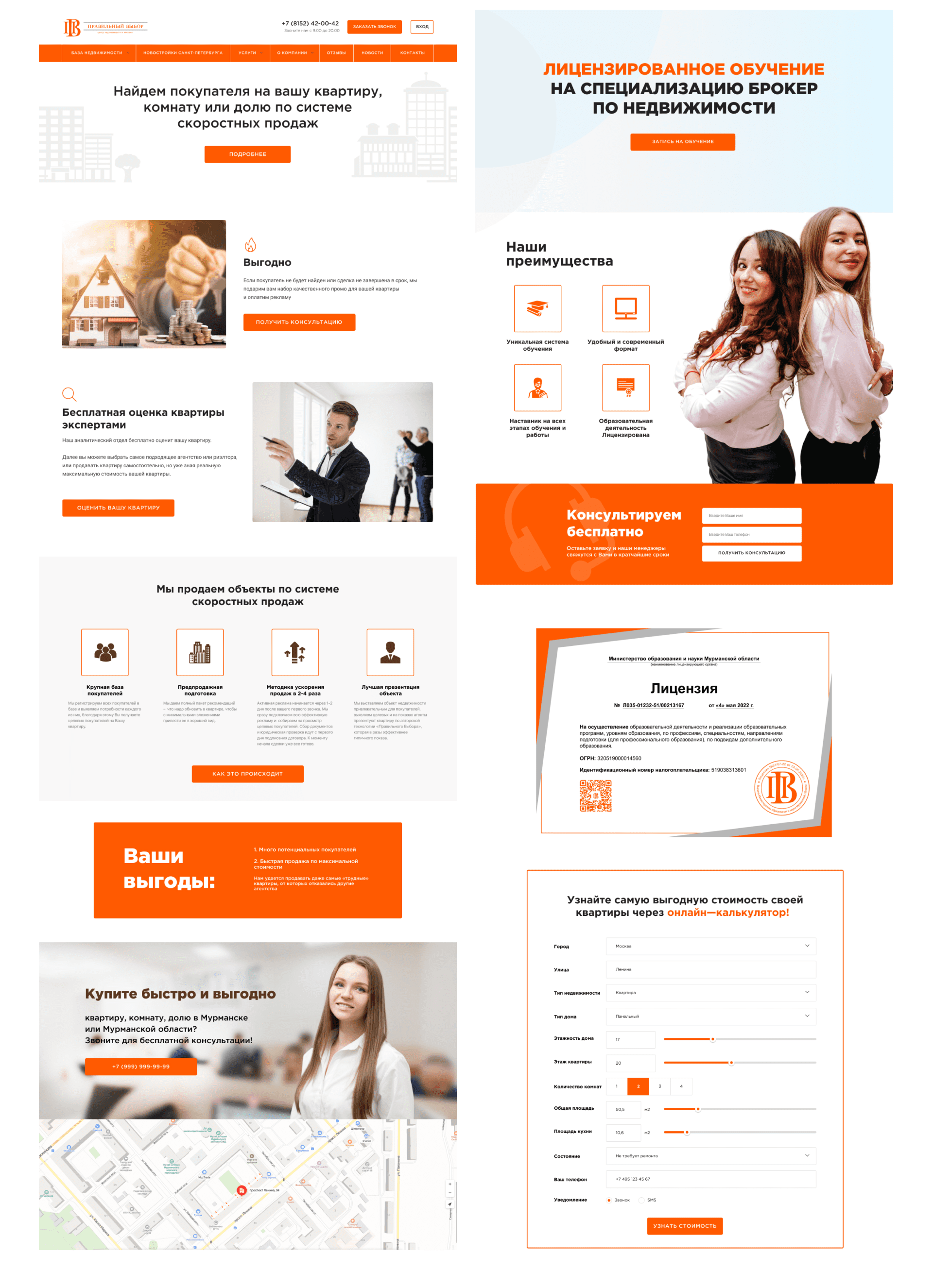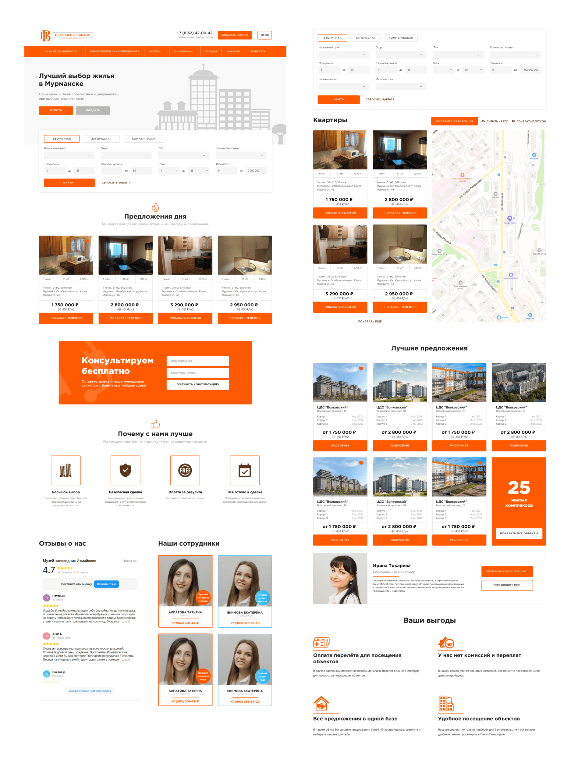 Собрать конверсионную платформу агентства: лид-формы «Найти покупателя/Оценить квартиру», консультация и обратный звонок; каталог с расширенными фильтрами и картой; карточки объектов, ЖК и «Предложения дня»; отзывы, лицензия и команда - всё для быстрых заявок.