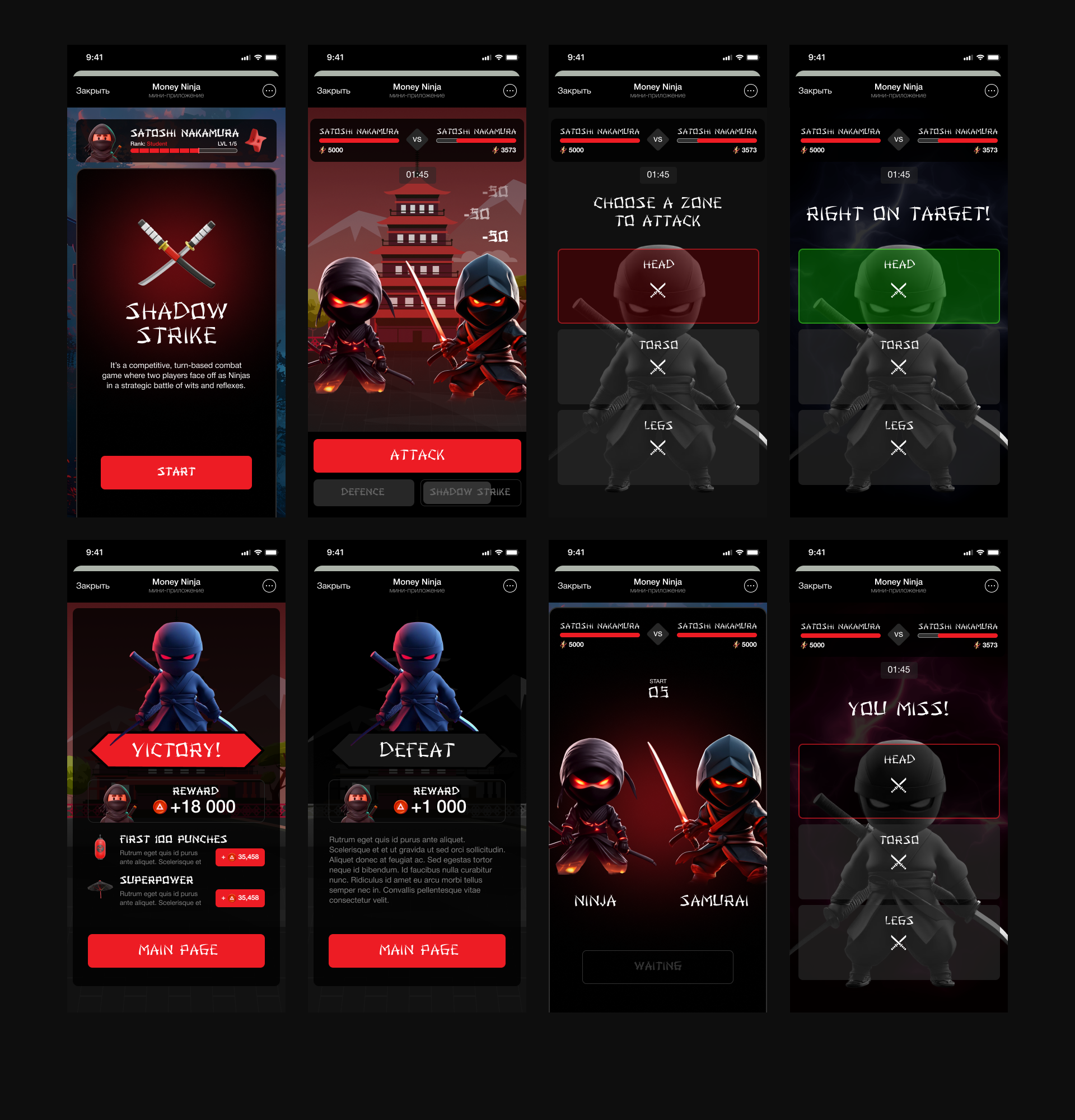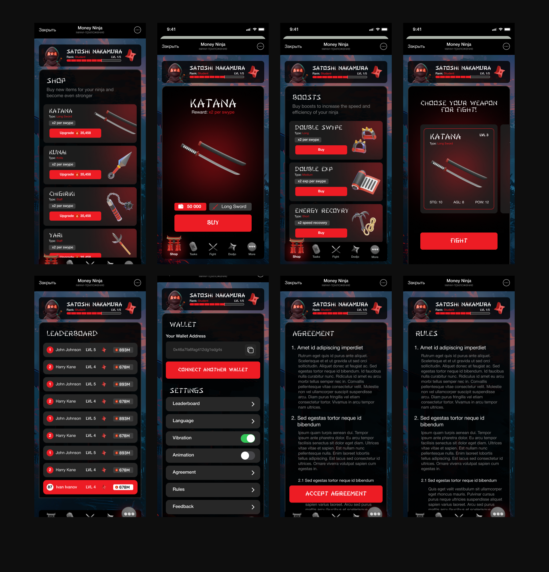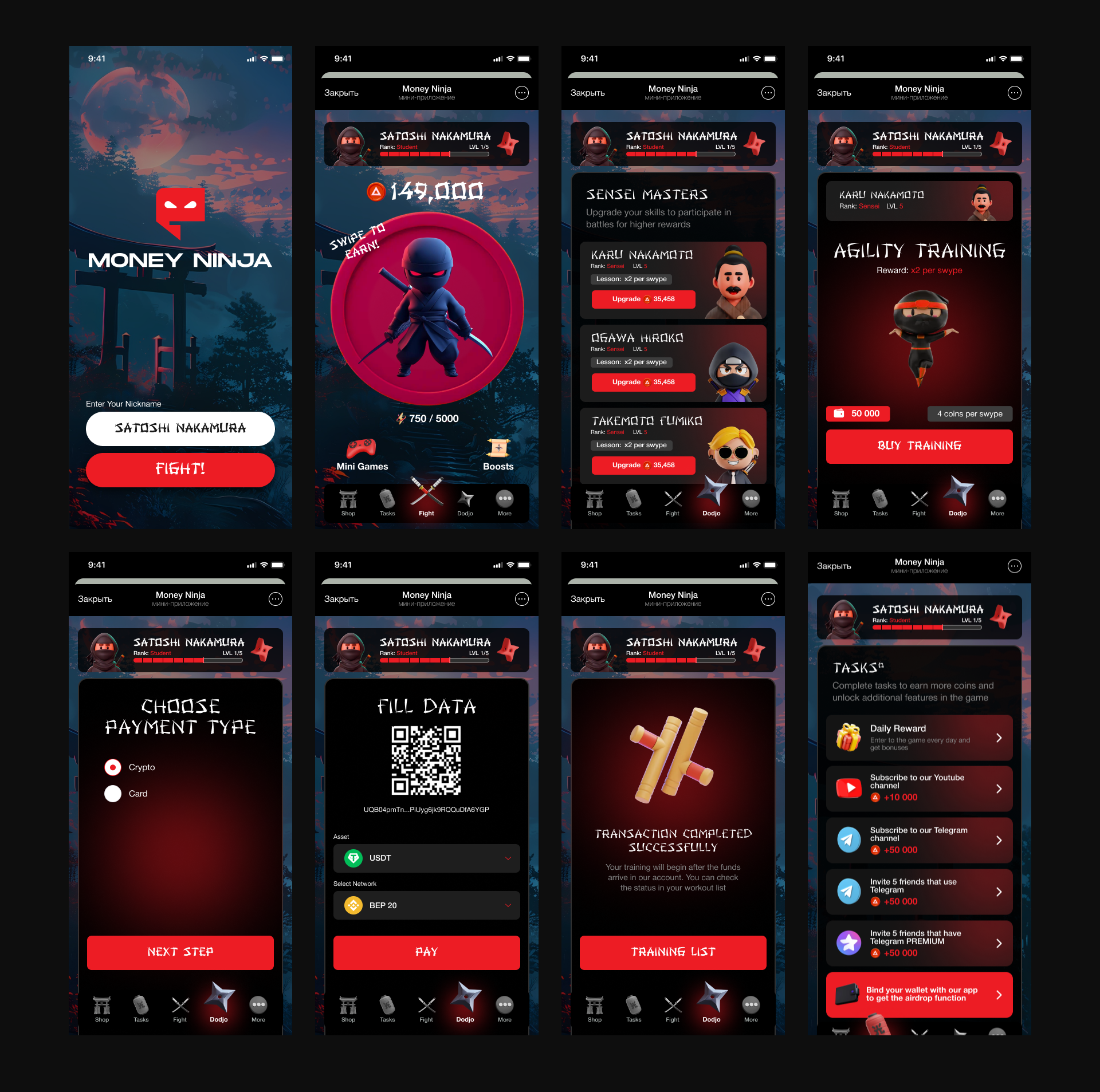 A dynamic swipe fighting game with three strike zones and skills (Shadow Strike), weapon selection and upgrades, training sessions, and Sensei Masters. Fast onboarding, wallet and early access, tasks and daily rewards. Payment by crypto/card, QR screen with token and network selection.