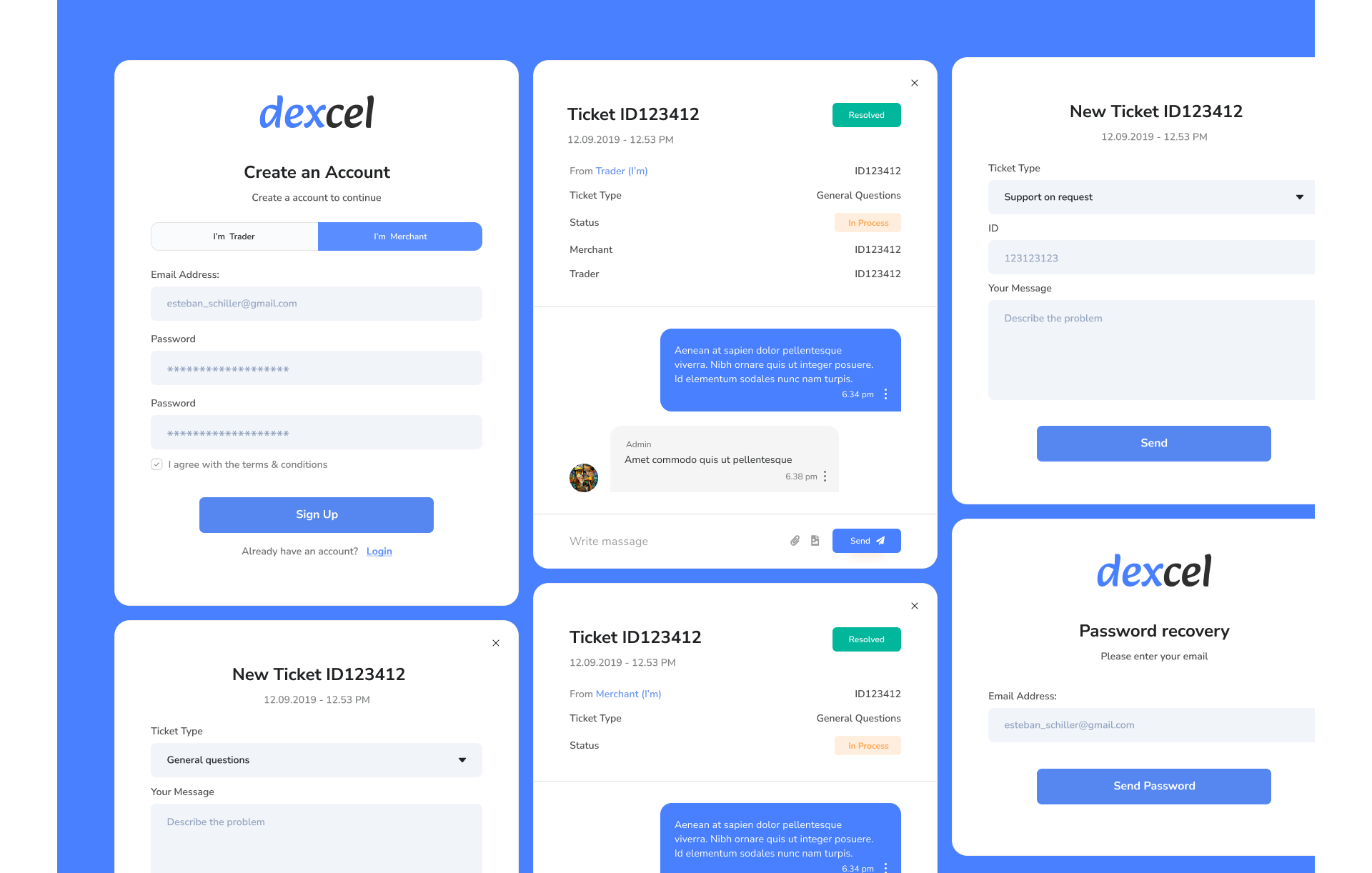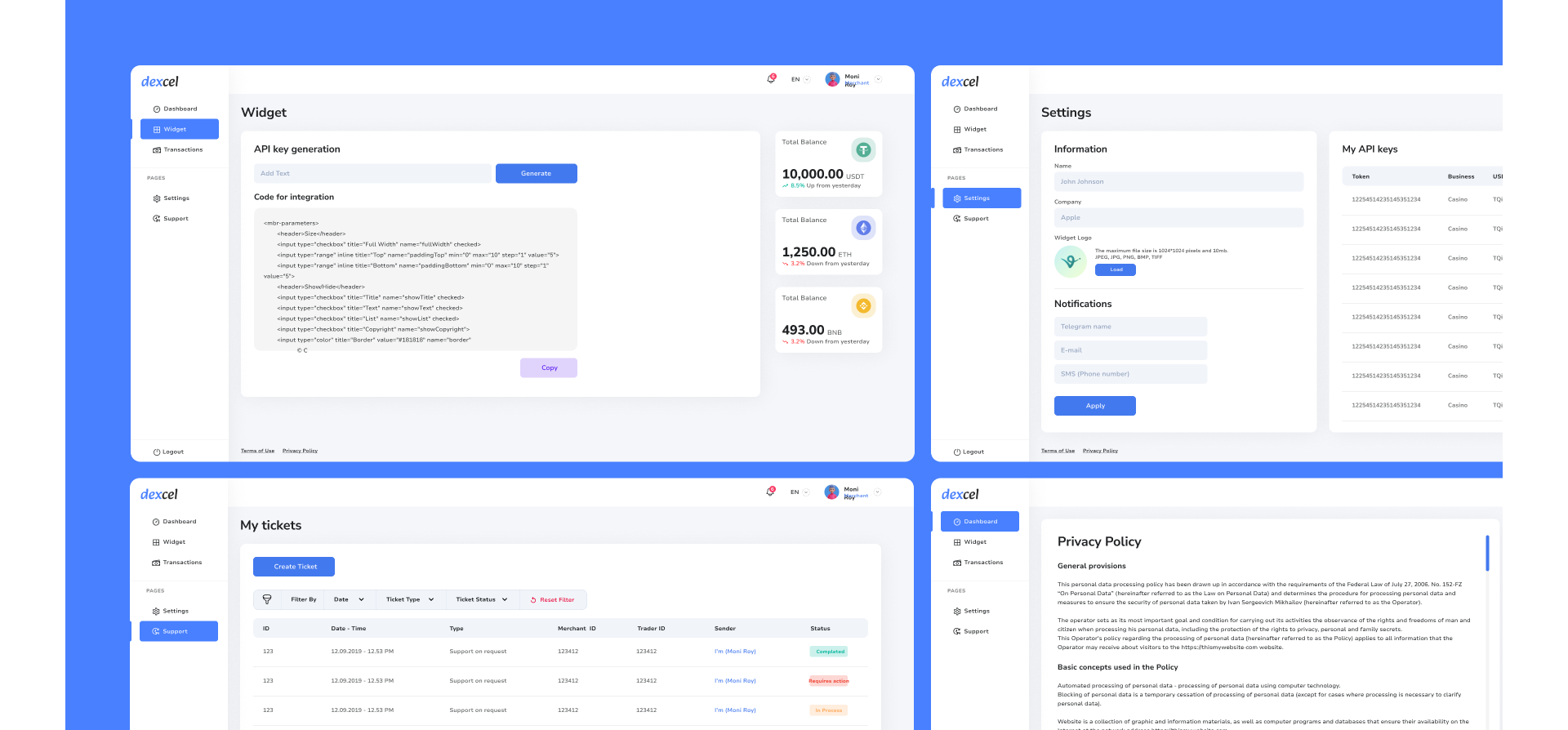 - UI/UX mockups: dashboard, widget/API keys, settings and notifications, transaction history, tickets, policies/legal pages — screens and visual concepts prepared (see screenshots).