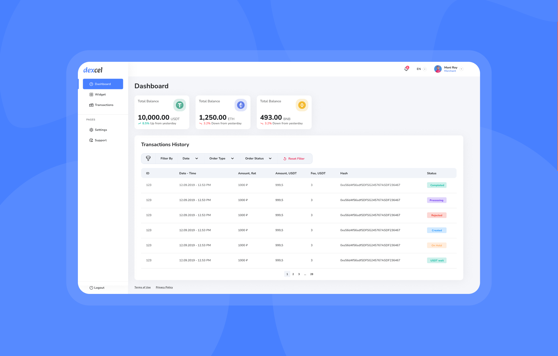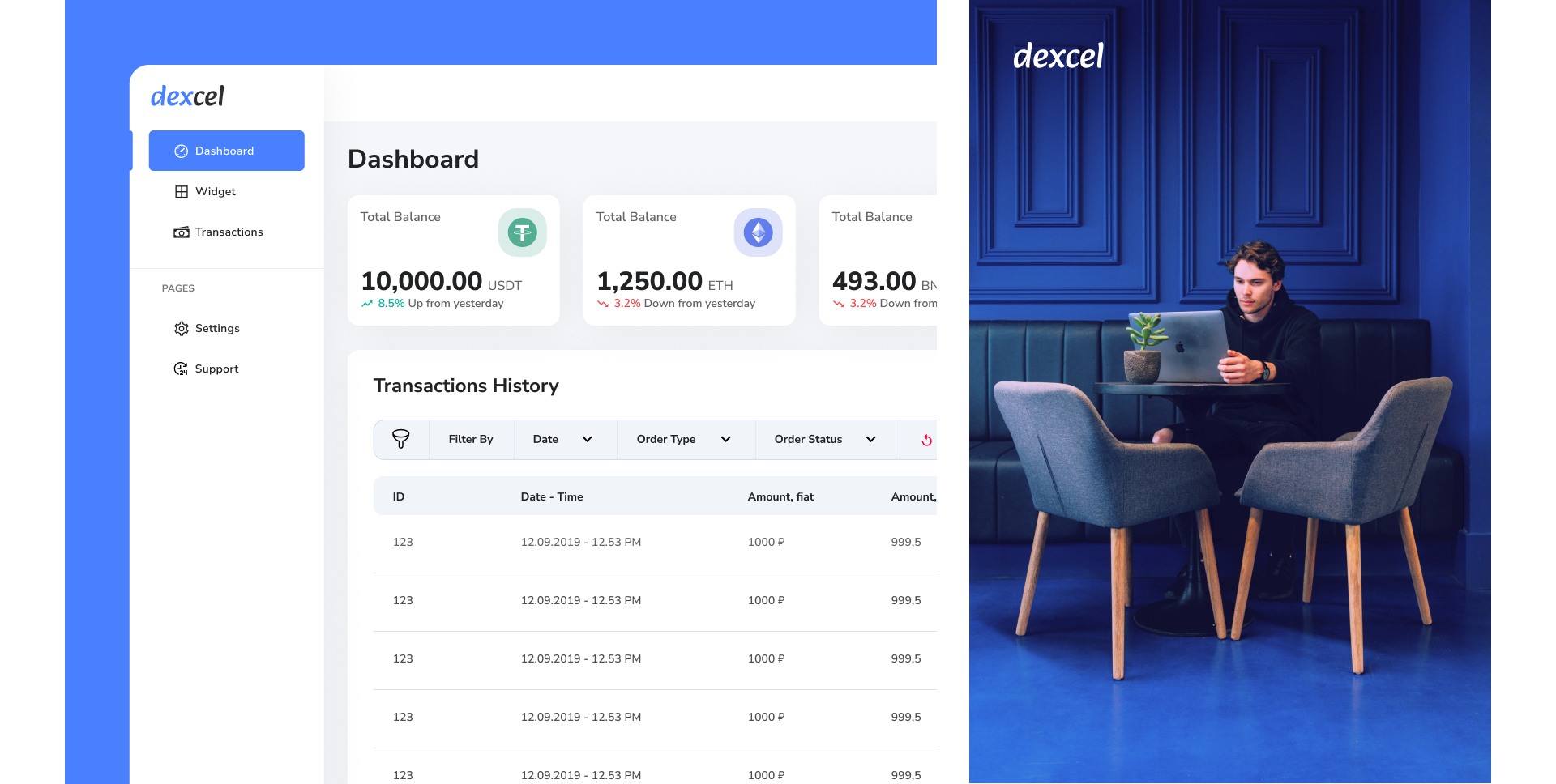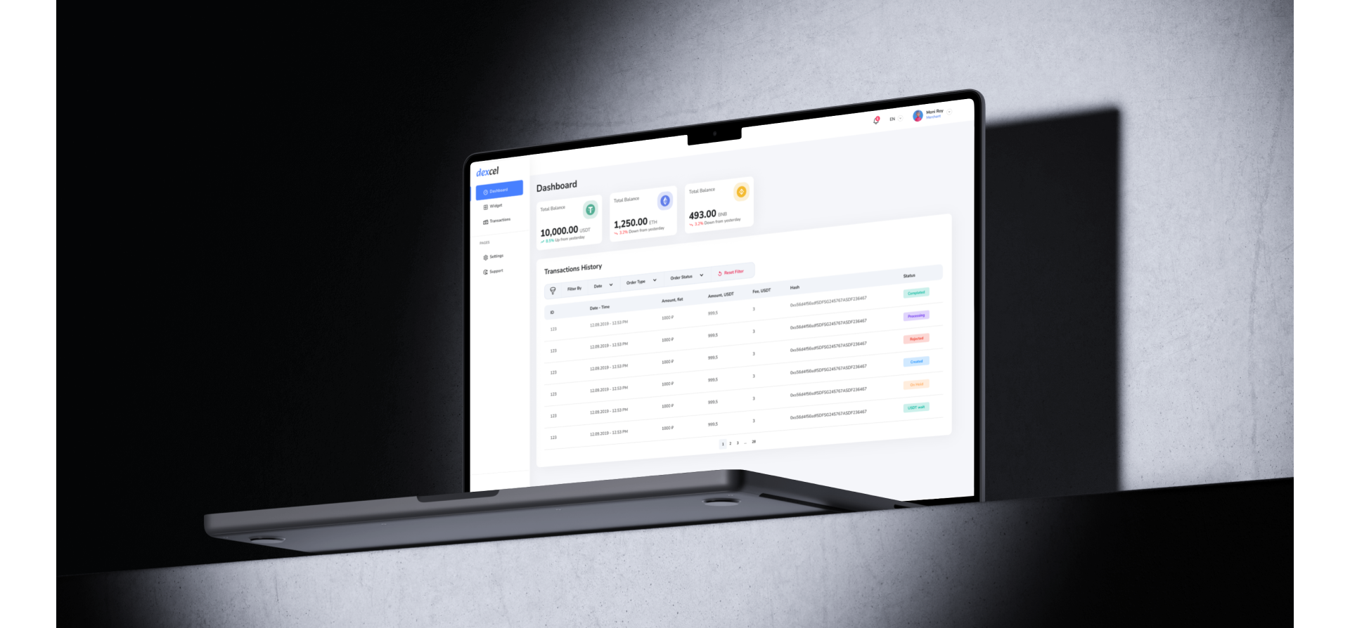 - DEXEL crypto processing system: acceptance of USDT payments via an embeddable widget, automatic selection of a P2P trader and reservation of payment details, fiat confirmation (SMS/Push), USDT transfer, blockchain monitoring, fees, admin panel, API, and webhooks.