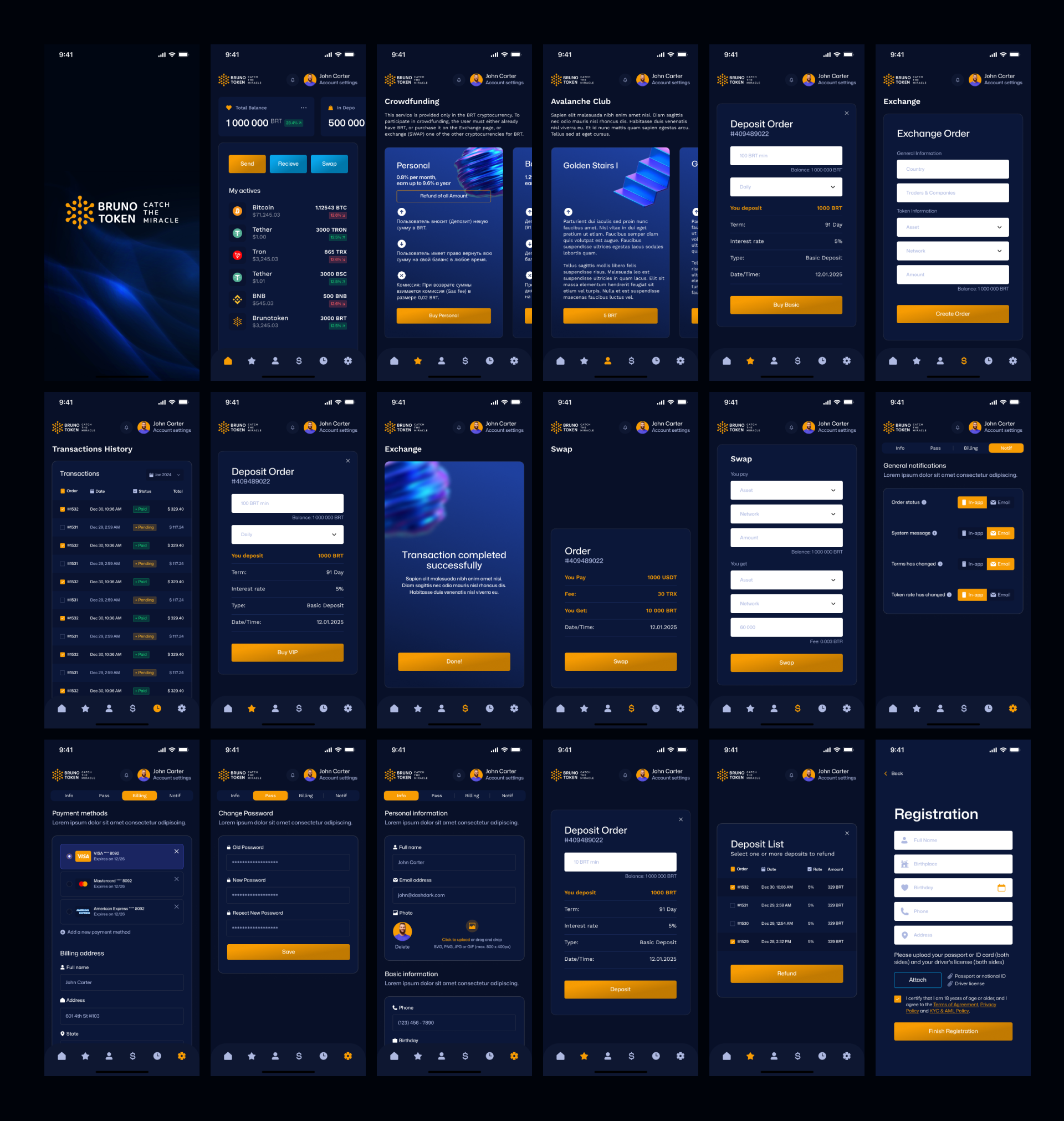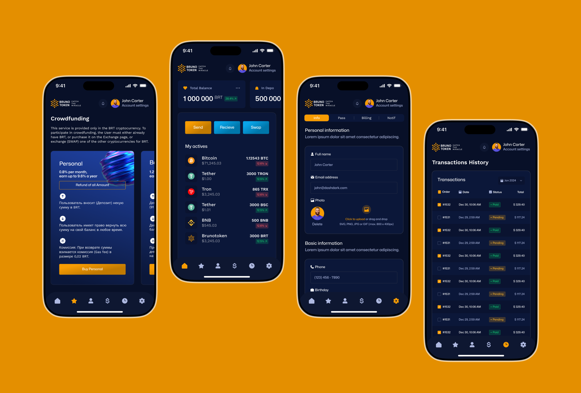 Develop a mobile application for Brunotoken investors: a wallet with quick actions Send, Receive, Swap, package purchase and club membership, deposits with rate calculation, exchange and SWAP, history and notifications, payments by card and crypto, registration with documents, and stable CI/CD.