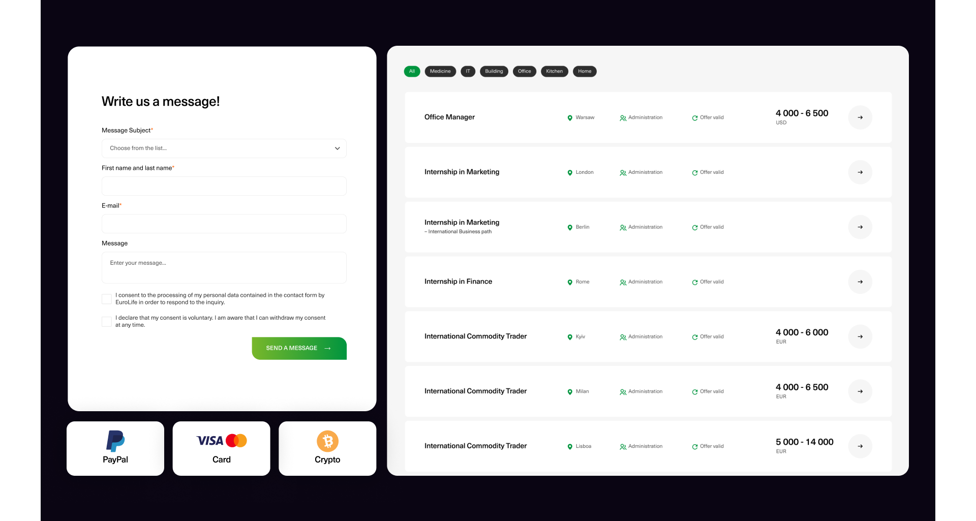 EuroLife is a platform designed to facilitate the employment of specialists from different countries in the European Union. The project offers a convenient vacancy application system and an integrated lottery for random candidate selection.